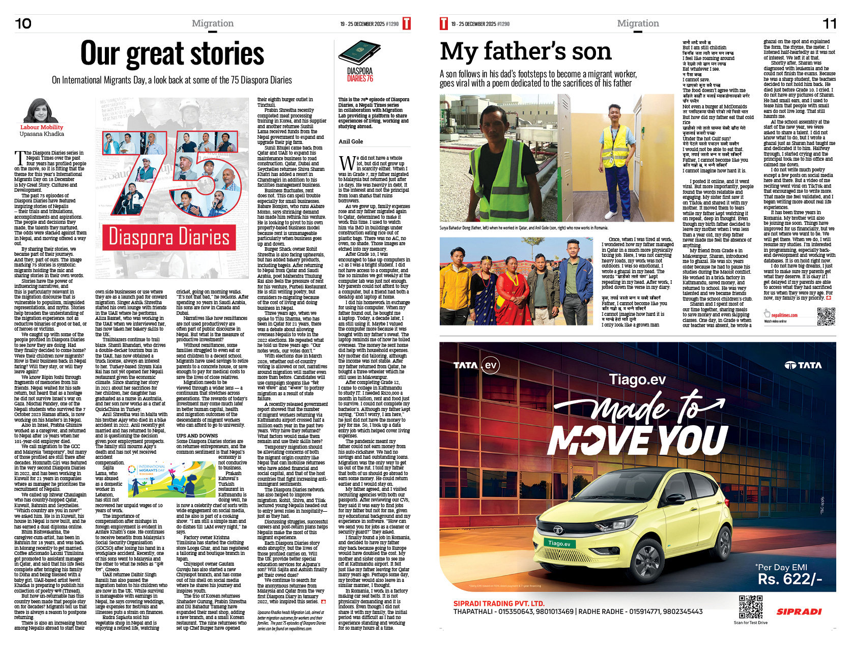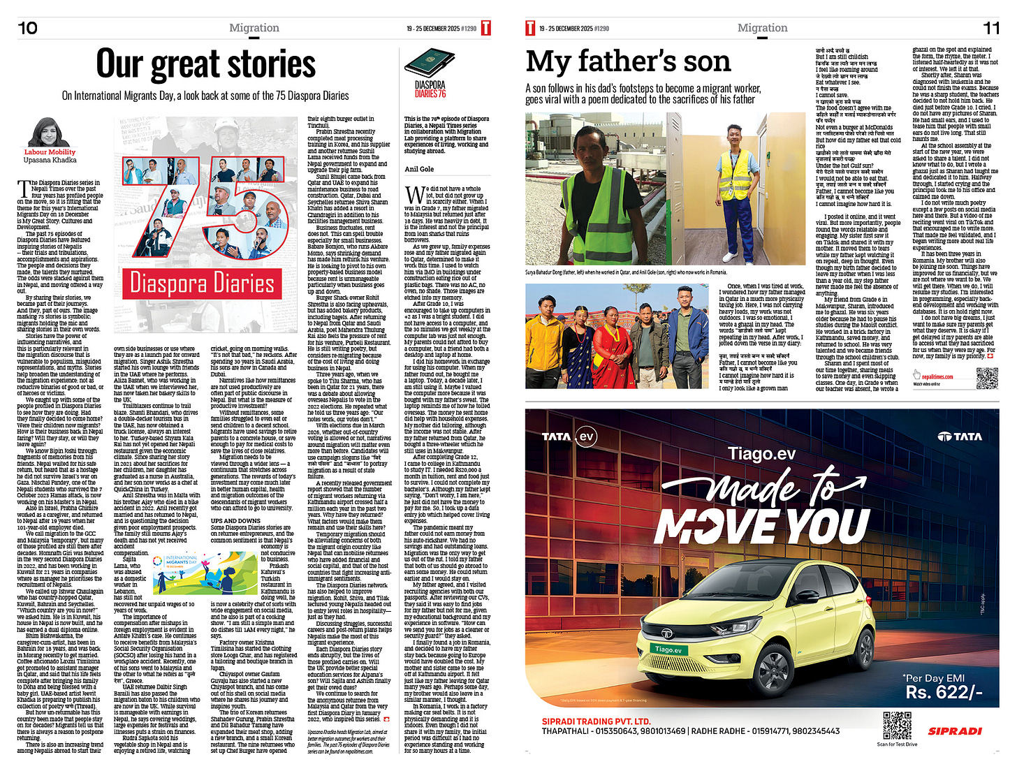 This edition of the paper marks International Migrants’ Day and the completion of 75 episodes of the series Diaspora Diaries in the past three years. In her Labour Mobility column, Upasana Khadka recaps the series and finds out how those profiled are faring. Some have prospered, some migrated again, others have passed the baton to their sons (Our Great Stories, and My Father’s Son, page 10-11).