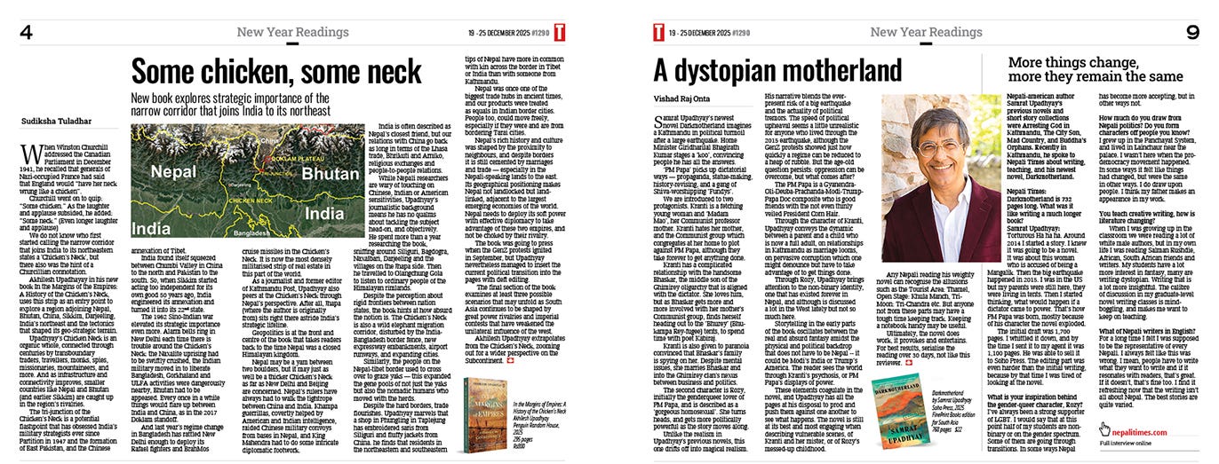 Two books by unrelated Upadhyays are reviewed in this issue. Akhilesh Upadhyay’s In the Margins of Empires is reviewed by Sudiksha Tuladhar (Some Chicken, Some Neck, page 4) and Darkmotherland by Samrat Upadhyay (A Dystopian. Motherland, page 9) is reviewed by Vishad Raj Onta, who also interviews the author.