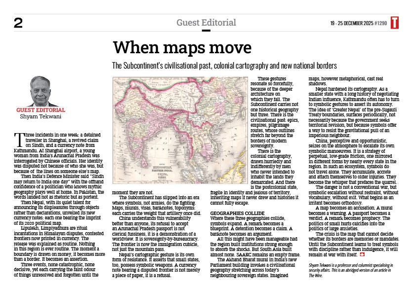 From here on, while still on the subject of maps, this newsletter switches to serious mode. Defence analyst Shyam Tekwani in his Guest Editorial on page 2, related three recent events that show territorial sensitivities. One of them is Nepal unveiling new banknotes with the Limpiyadhura map. Tekwani takes this as an example of how colonial cartography has left the Subcontinent with post-colonial angst about ‘borders we never drew and histories we cannot fully escape’ (When Maps Move, page 2).