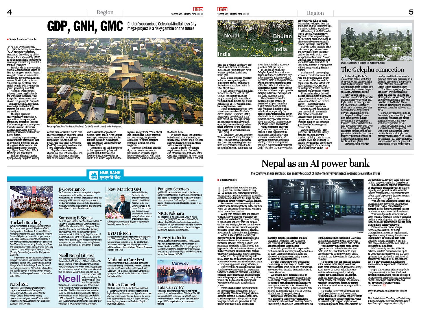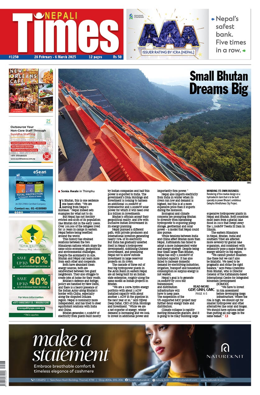There is a lot Bhutan and Nepal can cooperate on, and energy expert Bikash Pandey in his regular column, People Power, adds that Nepal also has the potential to turn its surplus clean electricity to attract investments in climate-friendly generative AI data centres (Nepal As an AI Power Bank, page 4).